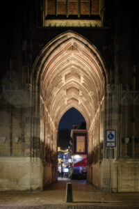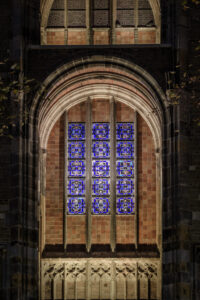 The new design also celebrates the unique stained-glass windows in the Chapels. During the day, the colours of these windows are imperceptible from the outside. Now, backlighting reveals their vibrant colours when looking towards the Tower from Dom Square or the ‘Servetstraat’ after dark. This detail remains lit for one hour after the main lights are switched off at 11 pm, which allows the windows to become the centre of attention for a brief period each day.
